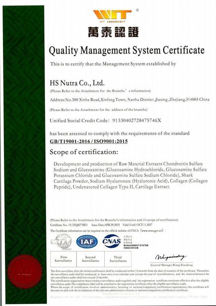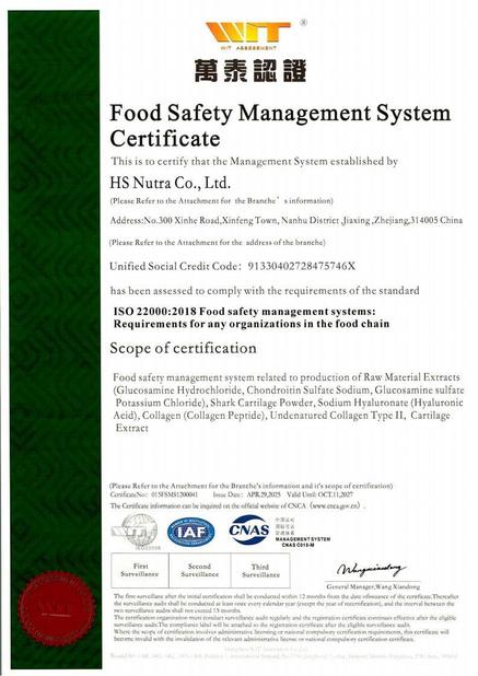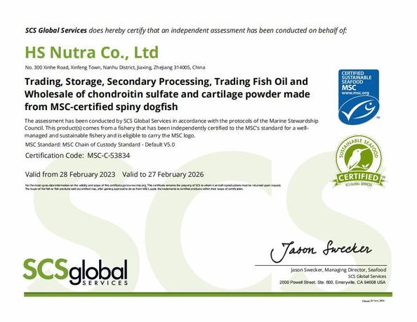 2014 mars--- Le MSC a vérifié pour assurer la poudre de chondroïtine de requin et de cartilage de requin. Il a été remplacé le 2 mars 2017 et valide jusqu'au 1er mars 2020.