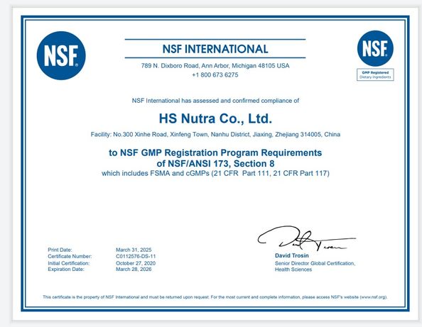 2012August --A reçu le certificat de NSF-GMP et énuméré comme fabricant de GMP des suppléments diététiques sur le site Web de NSF et remplace le certificat chaque année.