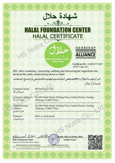 Nous avons mis la qualité en tant que notre engagement prioritaire à notre client. Nous avons établi notre système de gestion de la qualité selon le guidline de NSF-GMP. Nos installations productives et produits avaient reçu au-dessous des certificats de qualité.